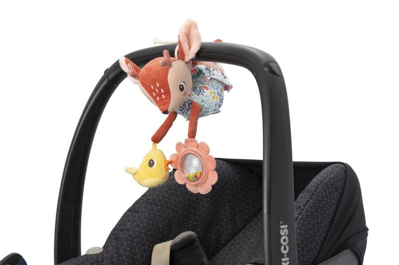 Stella y su amigo el pájaro juegan alegremente encima del bebé, mientras se aferra a su asiento. Stella juega con los sonidos, el tacto y los reflejos… ¡suficiente para intrigar a tu pequeño! Stella, la compañera de viaje, puede separarse fácilmente para convertirse en un peluche.